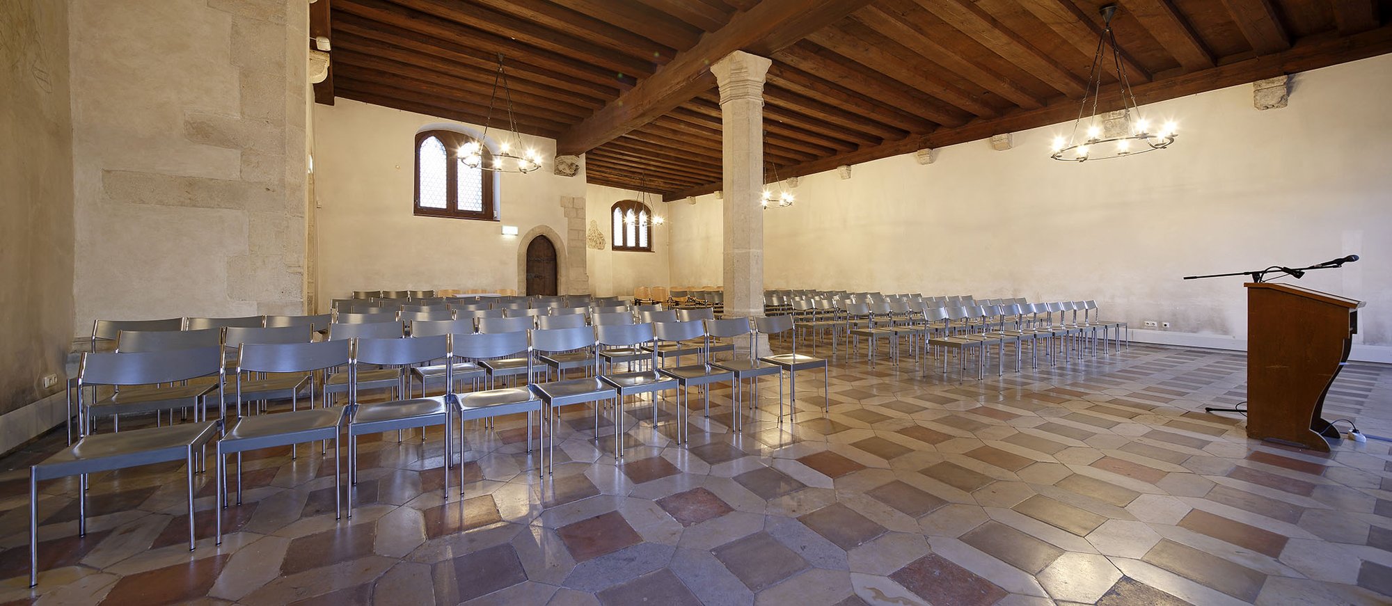 Der Saal bietet Platz für maximal 180 Personen und ist nur eingeschränkt barrierefrei erreichbar.